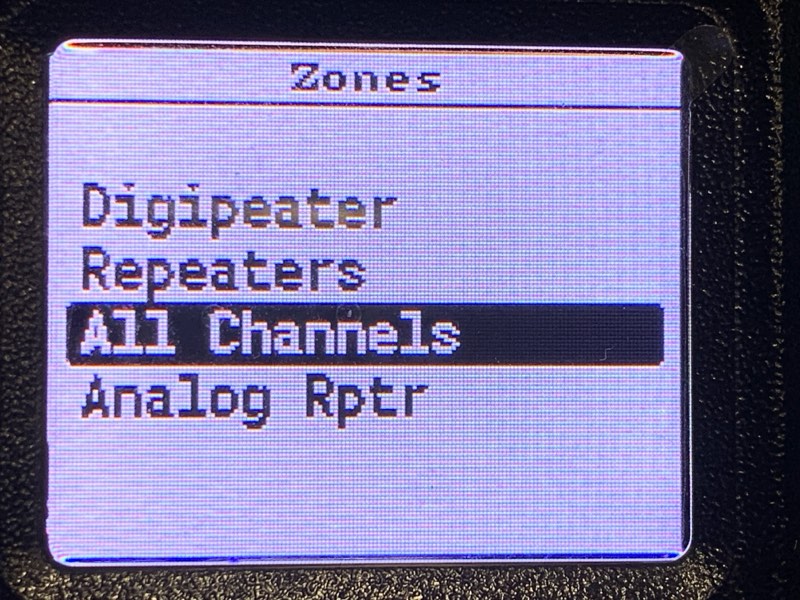続いて、APRS送信用のチャネルを選ぶ。今回は、APRSチャネルをどのゾーンにも割り振っていないので、All Channelsを選ぶ(デフォルトで存在している)。