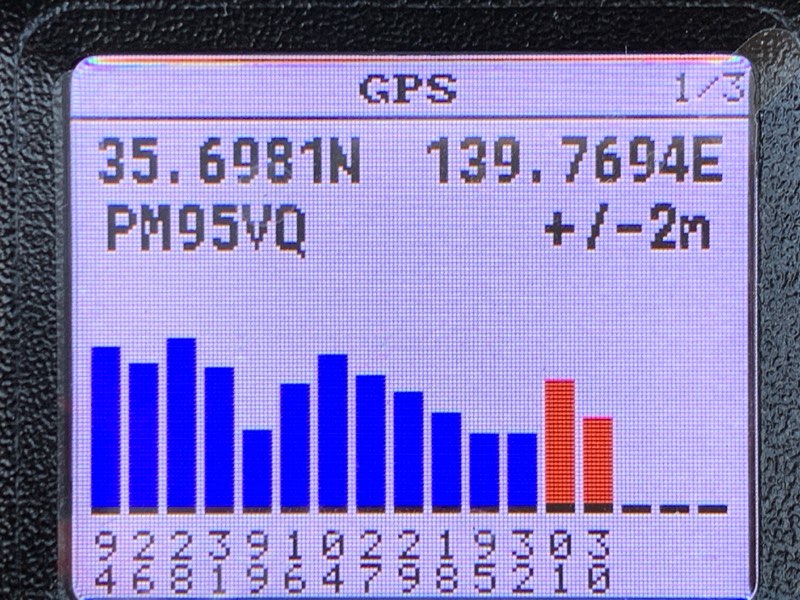 メニューのGPSを開くと、捕捉したGPSの情報が表示される。3ページある。