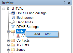 ちょっと補足。APRSの設定を追加するには、ツリーメニューのAPRSで右クリックすればメニューが出てくる。