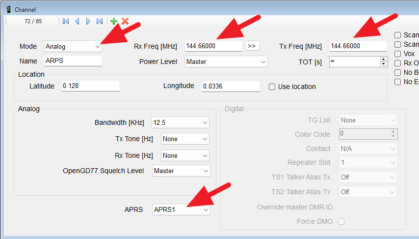 • Tx Freqは144.66 MHz。周波数はチャネルの方に設定があるのに、なぜここにもあるのかは不明。