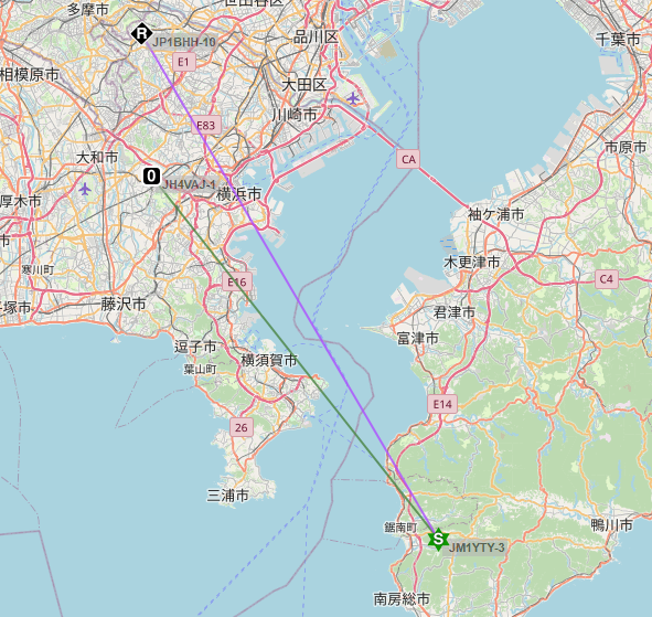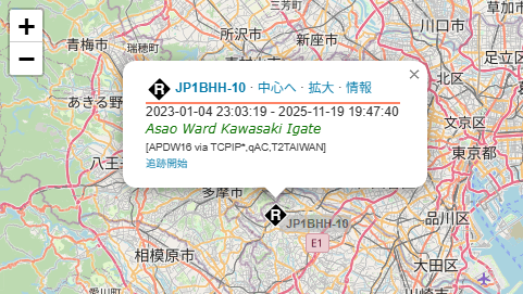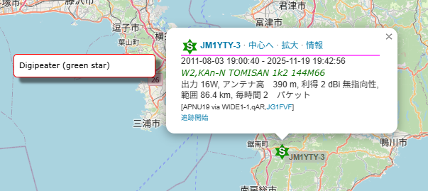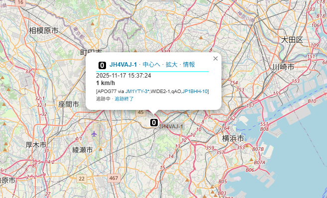 もうちょっと詳しく見てみると、私がいたのは横浜(内陸部)で、千葉のデジピータに拾われて転送され、それを川崎(内陸部)のIgateがaprs.fiに登録してくれたらしい。そうか、自分のビーコン送出の直後に聞こえてきたパケットは、デジピータが転送(再送信)してくれていたものか(このデジピータは、DMRデジピータとは別物)。「ACKなどないだろうに不思議だ」と思っていた疑問が解決。