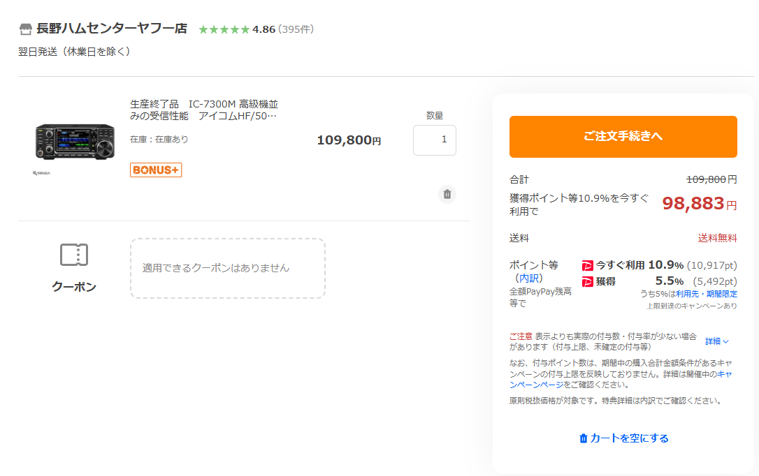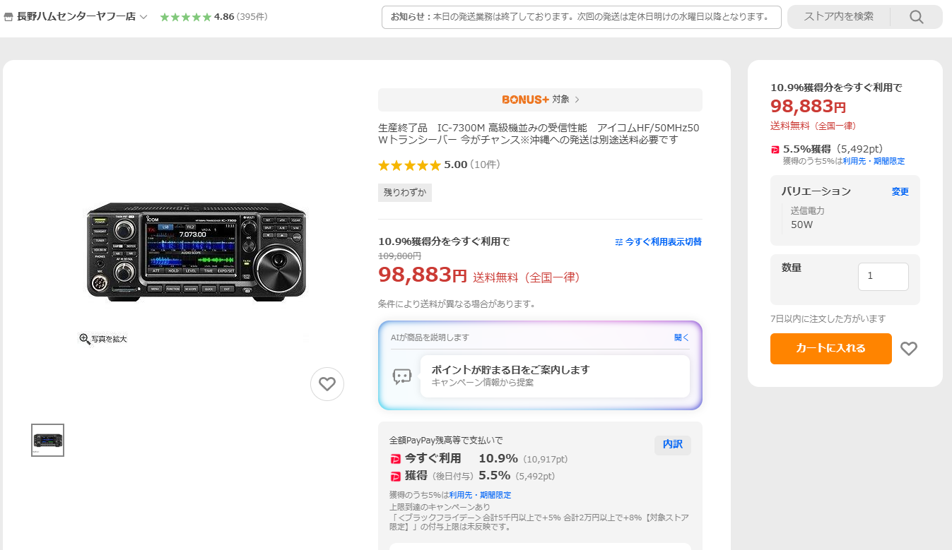 「長野ハムセンターヤフー店」のIC-7300Mの販売ページのリンクはこちら。