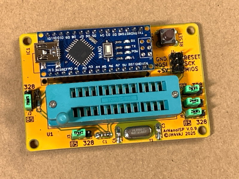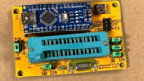 Arduino IDEのスケッチ例として入っているArduinoISPを使うとArduino UNOやNanoを書込みツールにすることができますが、毎回ジャンパ線で配線するのが面倒です。そこで、Arduino NanoとZIFソケットを一つの基板上に載せて、予め必要な配線を行った専用プリント基板を作りました。ATmega328PとATtiny85ならこれで書き込みできます。また、ISPピンヘッダも付けていますので、これを使って別の基板への書き込みもできます(Arduino UNOやNanoへのブートローダの書込みなど)。