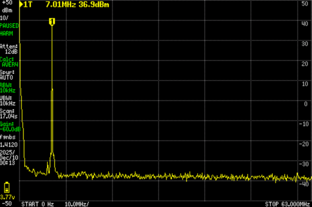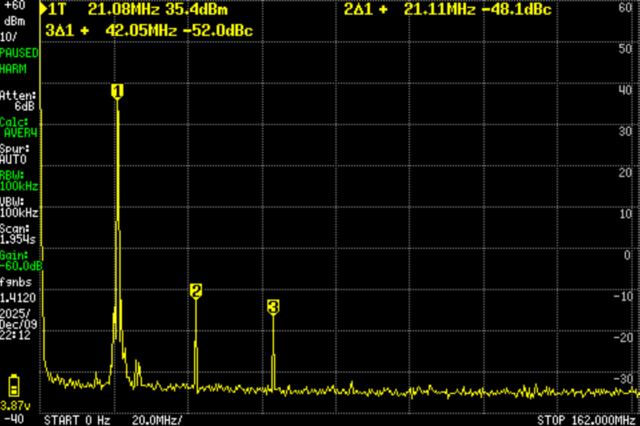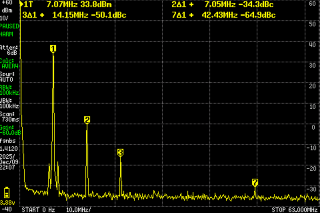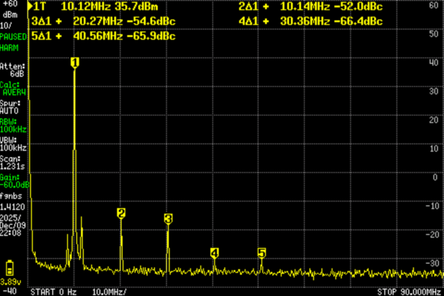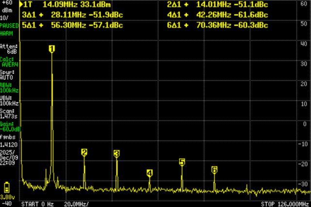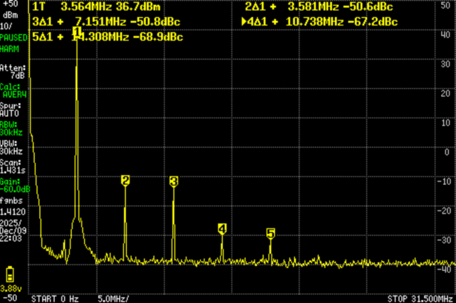 今回の装置は、30MHz以下であり、1Wを超え5W以下なので、スプリアス領域(主に高調波)の許容値は50μW(-13dBm)以下(5Wを超えていれば-50dBc)。詳細はこちら。