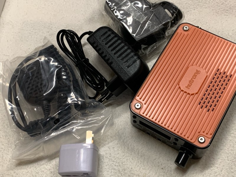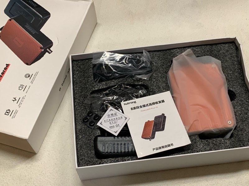内容物は、uSDX plus V2本体の他に、ハンドマイク(兼スピーカ)、ACアダプタ、充電アダプタ(ブラグ形状はEUスタイル)。白いのはBanggoodがおまけで付けてくれた変換プラグ。箱の外にテープで貼り付けられていたため、それが仇となって箱はかなり凹んだ状態で送られてきた。箱の中はクッションがしっかりしているので大丈夫だけど。