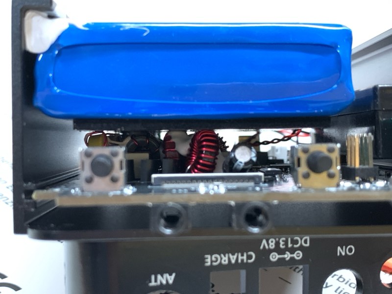 バッテリはケース側面にシリコンゴム接着剤(?)で貼り付けられていて、部品の上にクッションを挟んで載せられている。接着剤がしっかりしているので外れはしないだろうと思うけど、なかなか大胆な実装方法。