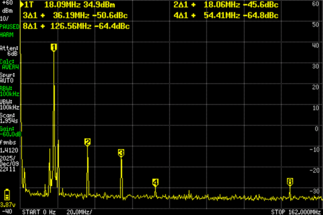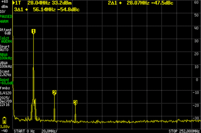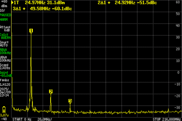 また、高調波ではないが、基本波の近く(20MHzあたり)に第二次高調波よりも大きなピークが見える。基本波に近いため、LPFでは対処不可能。信号生成方法(ファームウェア)でなんとかなるものなのだろうか?