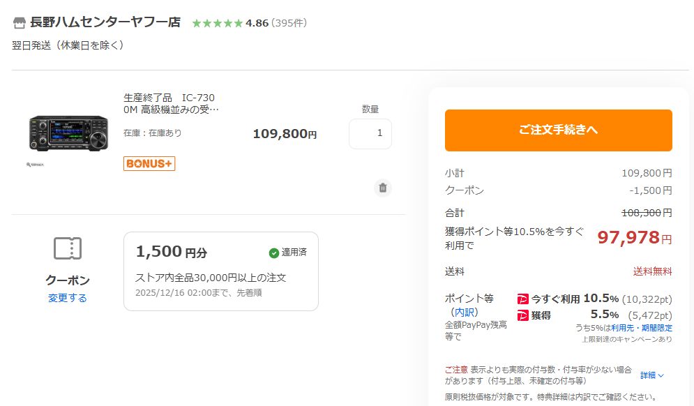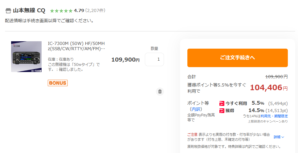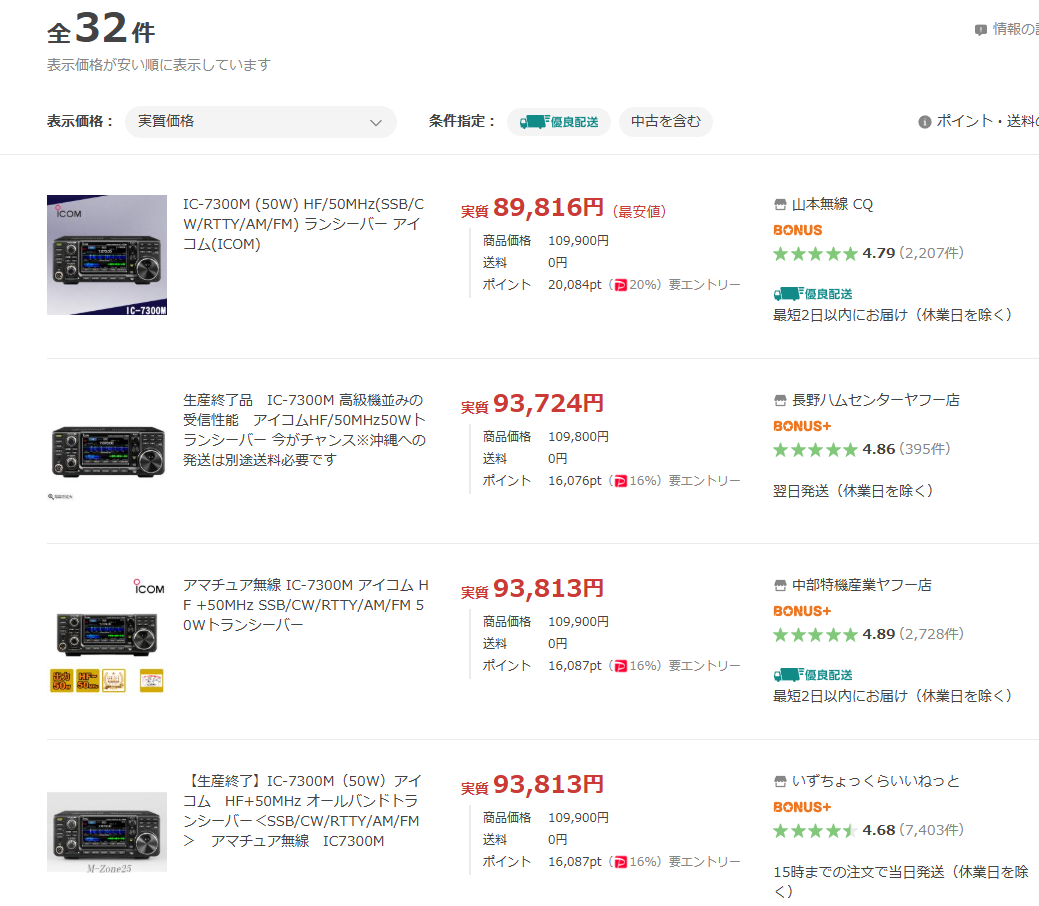 「長野ハムセンターヤフー店」のIC-7300Mの販売ページのリンクはこちら。