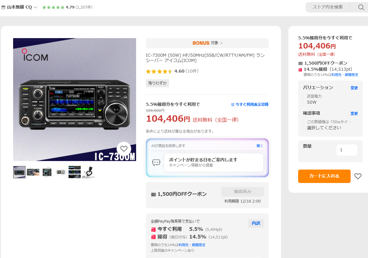 「山本無線CQ」のIC-7300Mの販売ページのリンクはこちら。