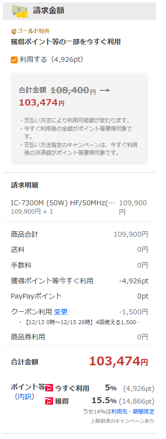実質額が9万円を割ったとは言え、上述のとおり、ポイントによる還元分がかなり多く、支払額は103,474円。まだ10万円を超えている。