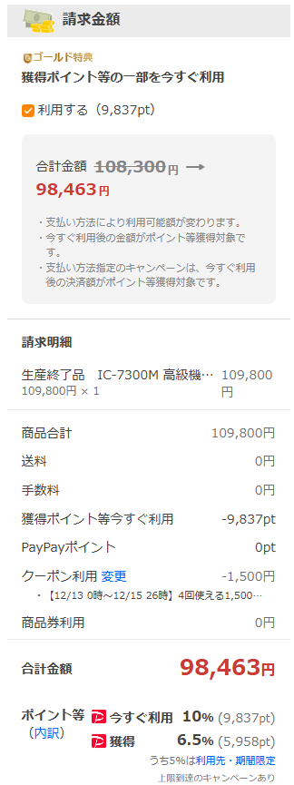 ここだと、支払額が98,463円で10万円割れ。ポイントが5,958なので、それを考慮した実質額は92,505円。9万円割れではないけれど、支払額が少ないことは大きなメリット。