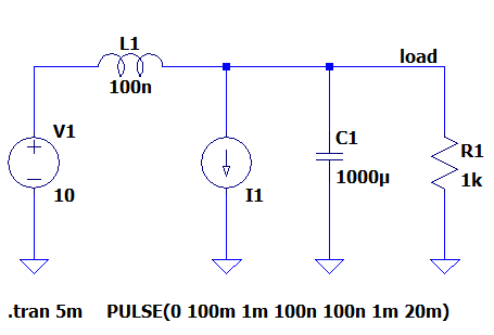 ノイズとして電流源I1を設定。100mV、開始から1ms後、立上りが100ns、立下りも100ns(1ms後)、最後の20msは持続時間(ここでは特段の意味はない)。