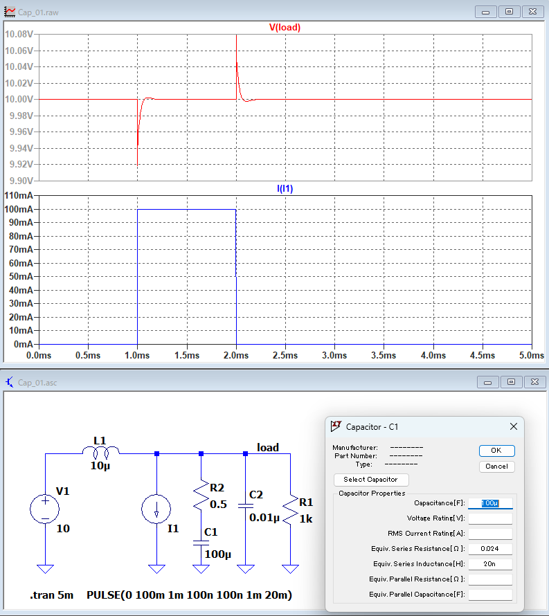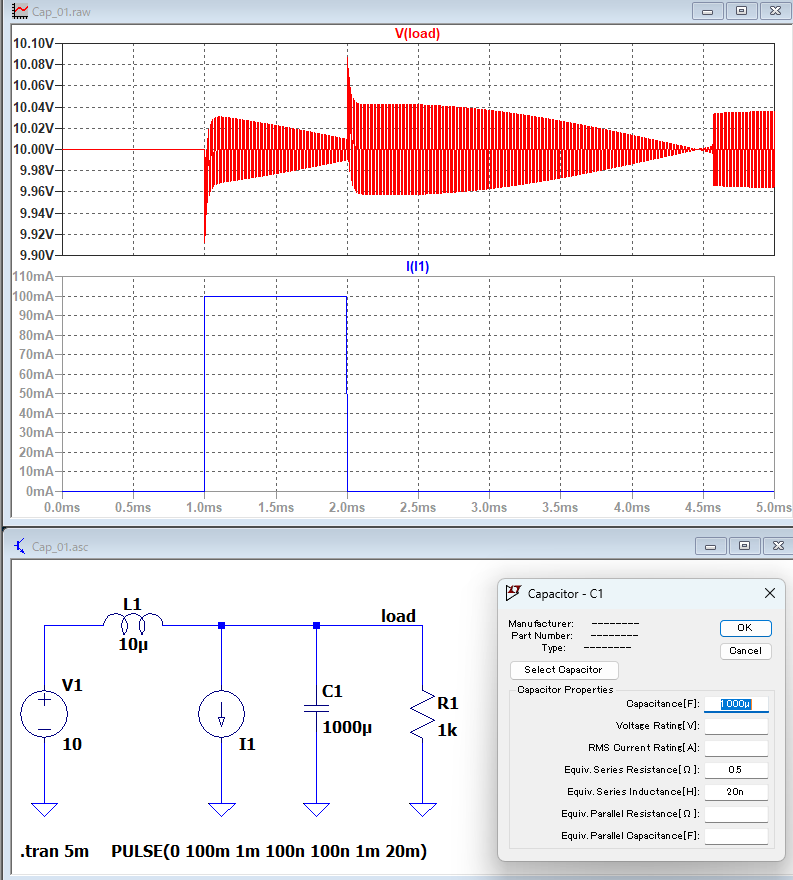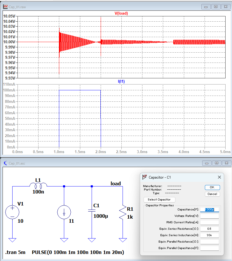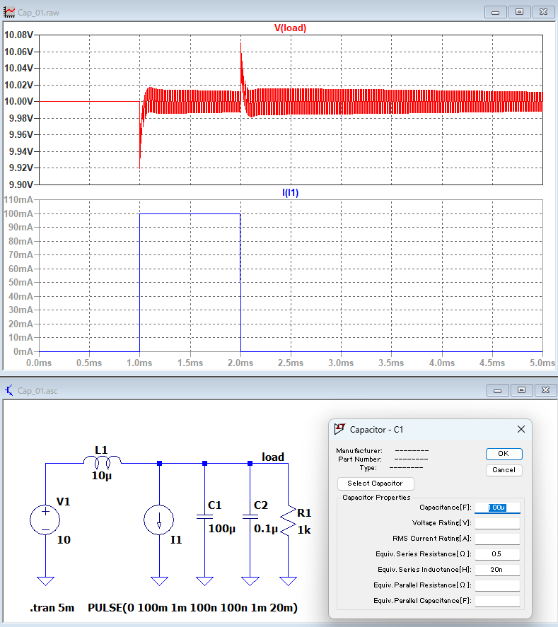ESR(等価直列抵抗)は0.5Ωを、ESL(等価直列インダクタンスは)20nHを想定。