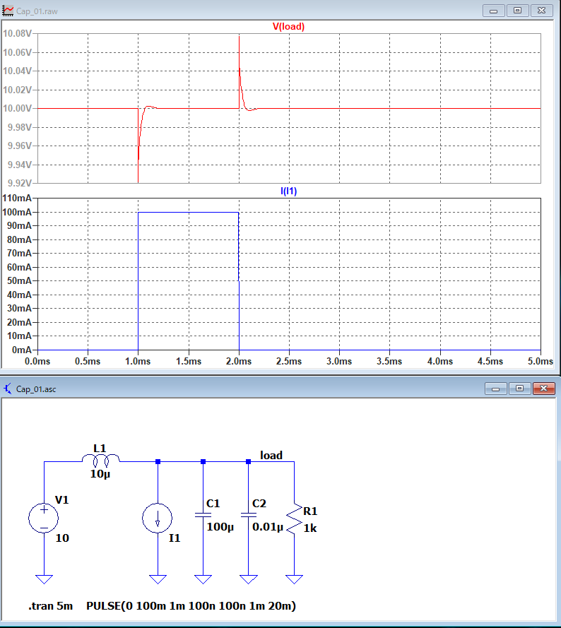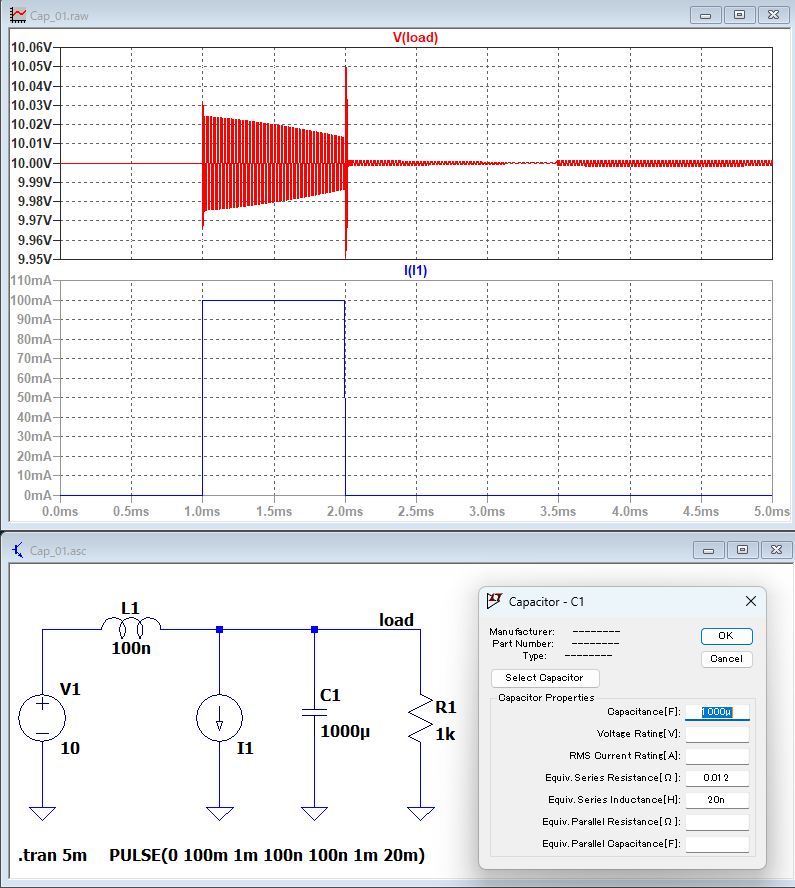 電源のパスコンとして、アルミ電解コンデンサとOS-CONを使った場合の波形をシミュレーションで確認してみる。