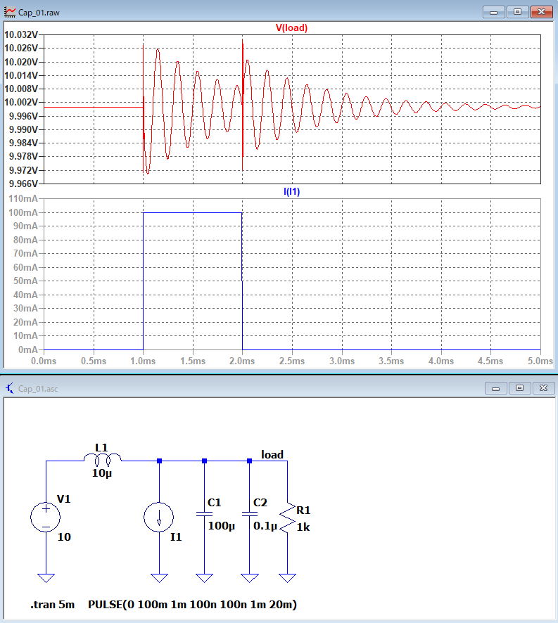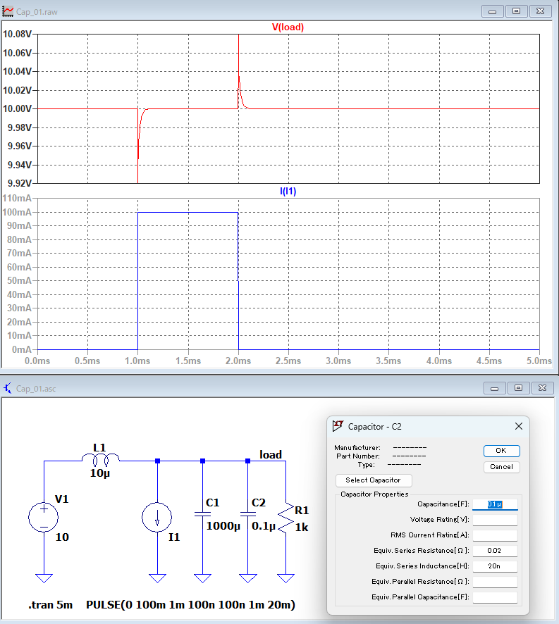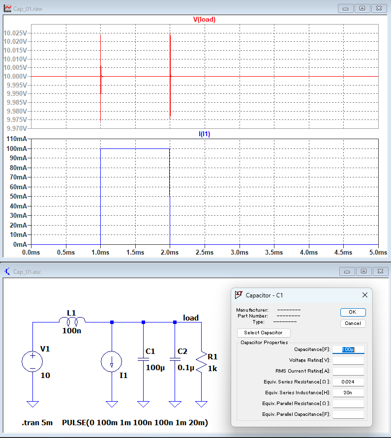 0.1μFの積層セラミックコンデンサをパラ付け。ESRは20mΩ、ESLはリードタイプを想定して20nHとした。チップタイプならリード線がないのでESLは数nHだろう(ESRも少し下がる)。