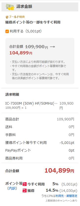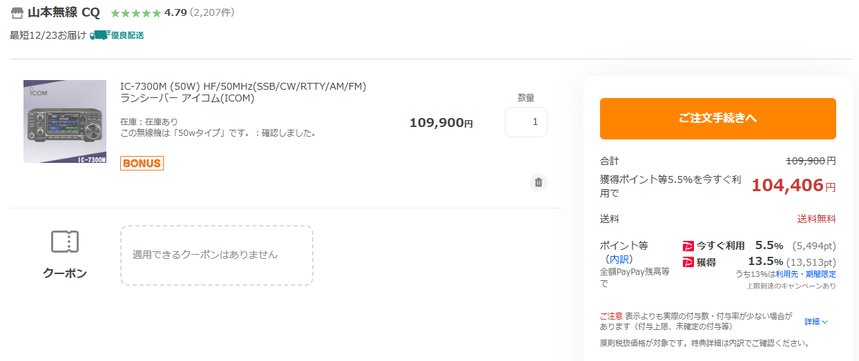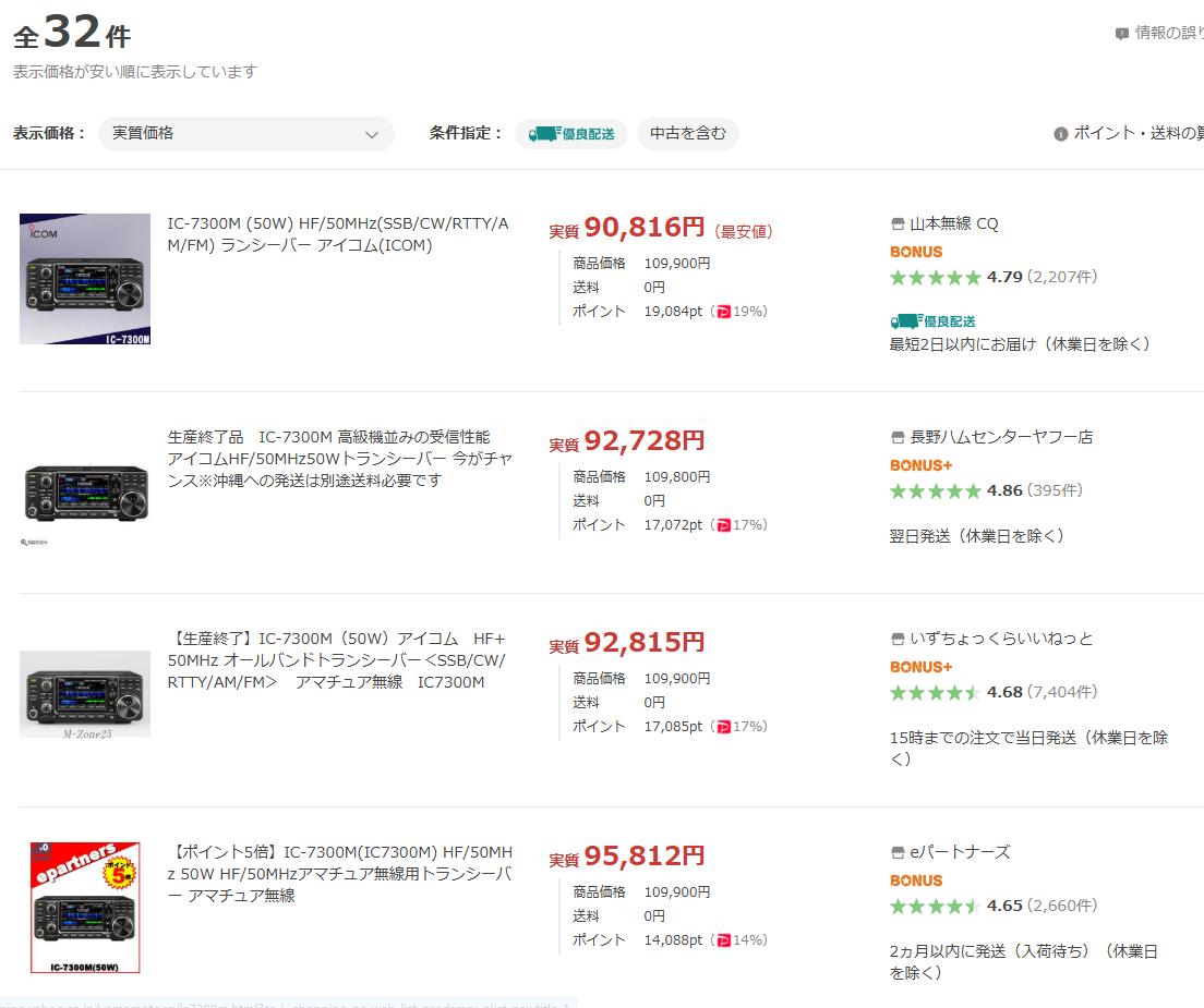 【定点観測】IC-7300M、本日のお値段(90,869円)