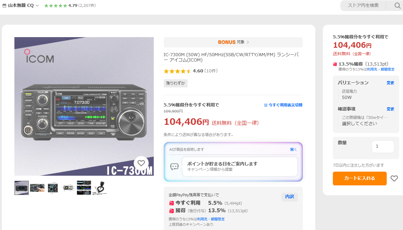 「山本無線CQ」のIC-7300Mの販売ページのリンクはこちら。