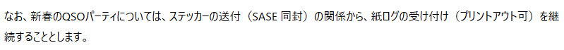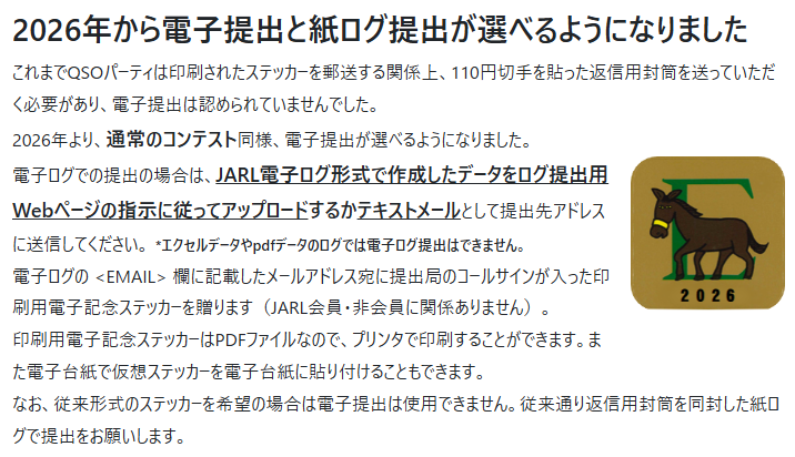 QSOパーティは今回(2026)年から、電子ログにも対応することになった(ステッカはPDF配布)。また、紙ログ(+SASE)で提出すれば、従来通りのステッカがもらえる。