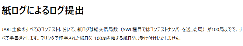 がーん。なんと、紙ログの場合は手書き限定とのこと。まぁ、省力化を考えれば電子ログが基本というのは理解できる。しかし、QSOパーティでステッカをもらうために、わざわざログを手書きするのものなぁ…。