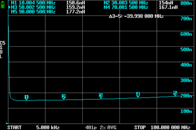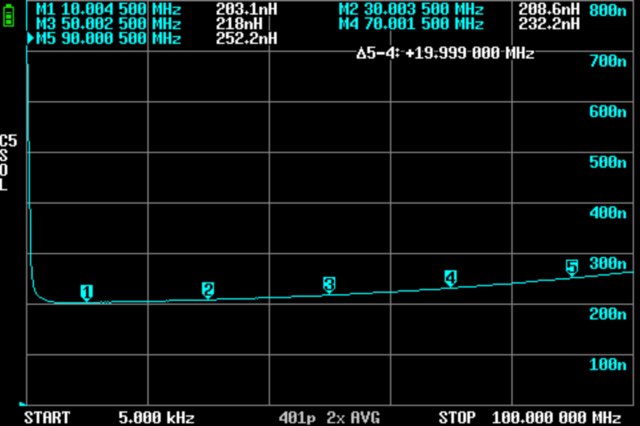 ちなみに、DE-5000で測ったら8回巻きで0.306μH、7回巻きで0.254μHだった(もちろん、DE-5000はキャリブレーションを実施してから測定)。測定周波数はDE-5000の最高周波数の100kHz。ただし、DE-5000の場合は、コアの巻線からのワイヤ分も測定に入るはずなので、数十nHほど大きめに出ているだろうと思う。それを差し引くと、LiteVNAの10MHzでの測定値に近そうではある。いずれにしても、計算値よりはだいぶ大きい。