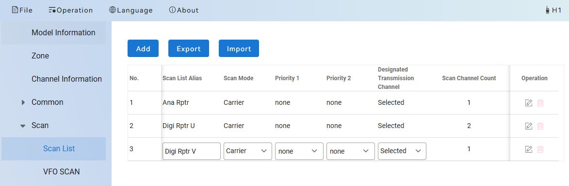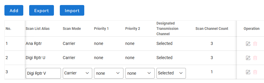 チャネルの設定の際に、スキャンリストの選択項目があるので、予め作っておく。これは入れ物みたいなもの。アナログレピータと、UHFデジピータ、VHFデジピータを登録したいので、それぞれのリストを作った。どのリストに属するかと言うだけの話なので、リストは一つでも構わない(スキャン時に区別なく全部スキャンするだけ)。