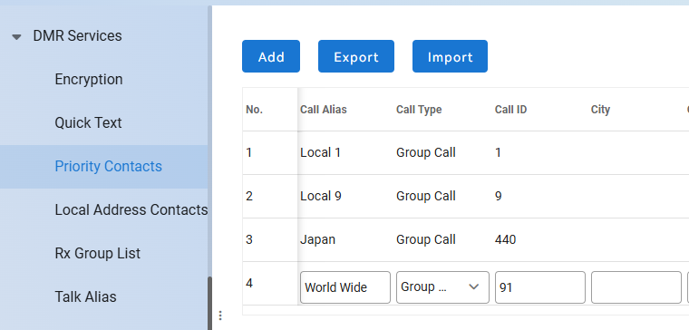 DMRで出てくるトークグループは、ここではDMR SearvicesのPriority Contactsとして登録するようだ。