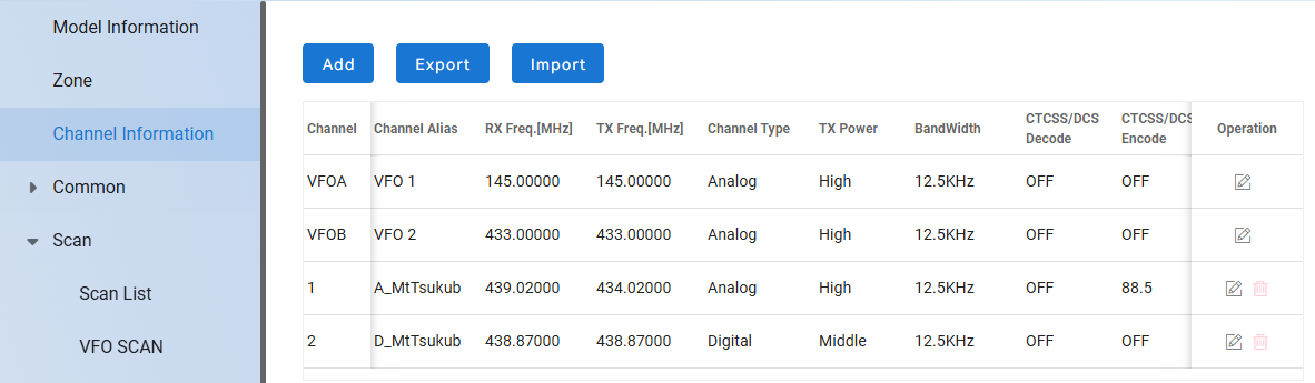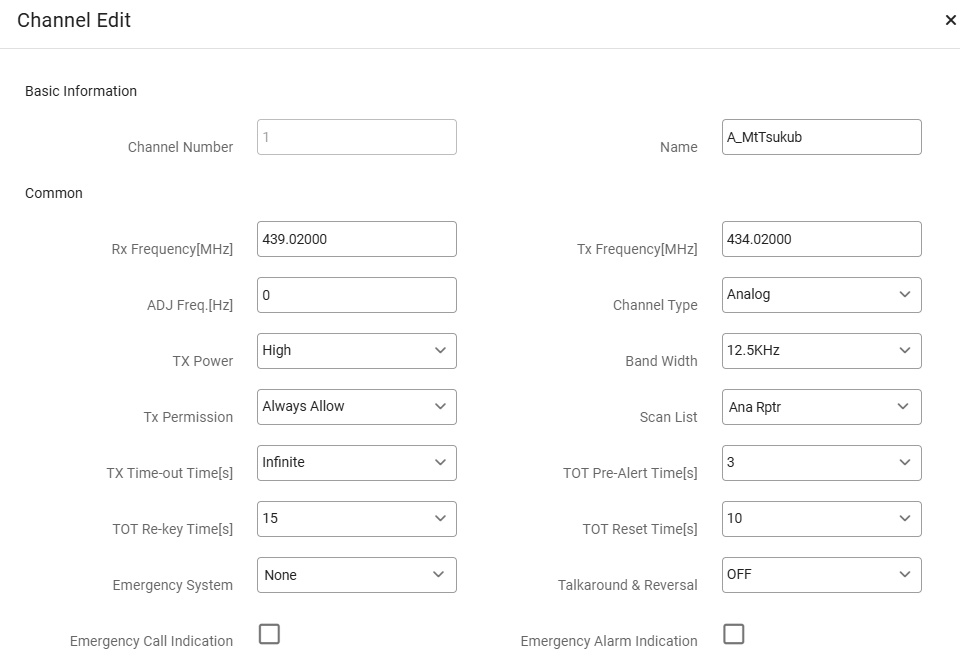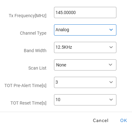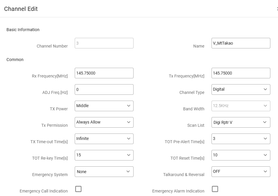 目的はDMRデジピータやアナログレピータにアクセスできるようにすること。そのためには、レピータの周波数をチャネルとして登録する。