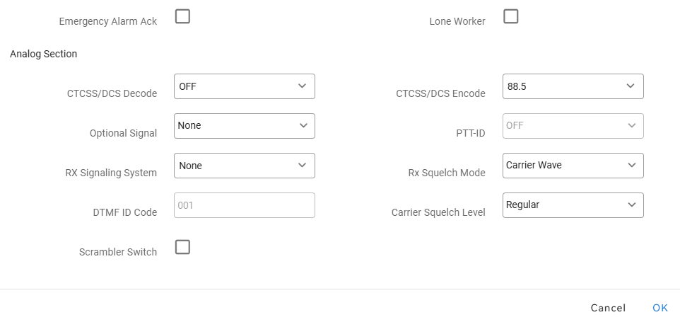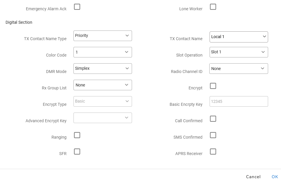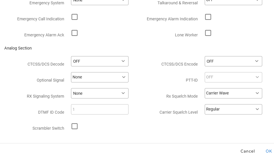 ここをNoneにするとCommonのSettingsで設定したRadio IDが使用される。None以外の選択肢はDMR ServicesのRadio ID Listに設定したものであり、それを選べばそちらが使われる(実機での動作で確認)。言い換えれると、チャネルごとにRadio IDを変更できる。
