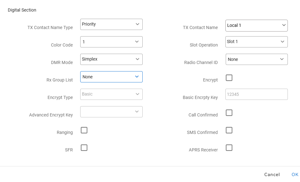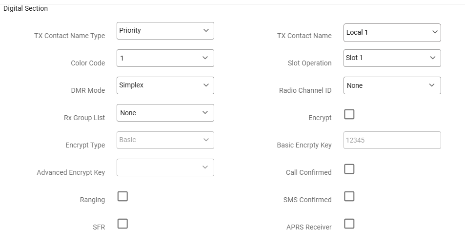 Color Codeが1、TX Contact Name(Talk Group)はLocal 1(自分であらかじめ登録したトークグループ)、Slot OperationはSLot 1。