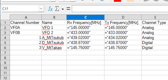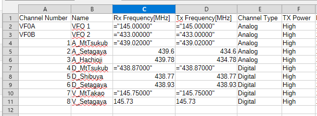周波数は、雛形では「=”439.02000″」のようになっているけれど、上のように「439.6」と数字だけ入力するので大丈夫だった。