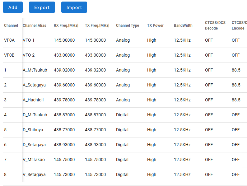 この例ではアナログレピータを三つ、UHFデジピータを三つ、VHFデジピータを二つ登録した(UHFデジピータを「D_」としたのは、「U_」だと「V_」と紛らわしいため)。