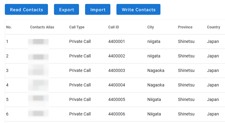 上が読み込んだ状態。Contacts AliasにCallsignが入っている。もし、Callsign+First Nameを指定してダウンロードしたなら、ここにそれが入る。言い換えると、CallsignやNameなどの欄はなく、Contacts Aliasにまとめて入ってしまうので、Callsignだけにしたほうがシンプルで良いと思う(あくまで好みだけど)。