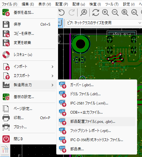 部品配置ファイルは基板エディタで「製造出力」の「部品配置ファイル」で生成できる。
