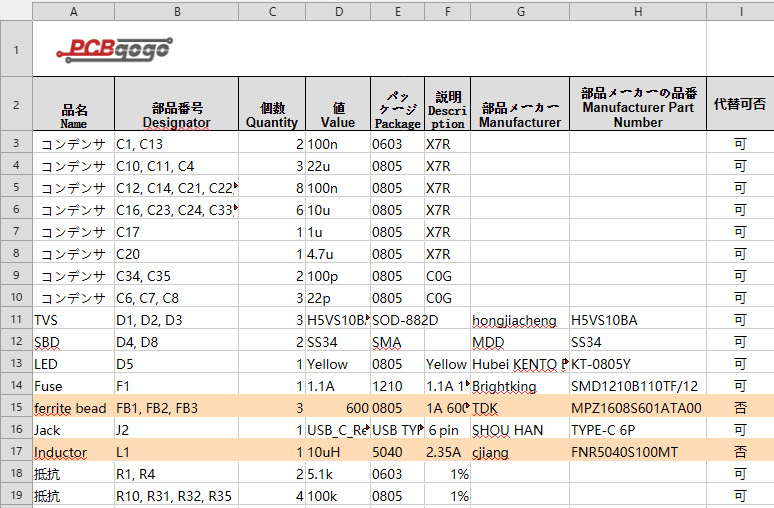 部品はPCBGOGOに調達してもらうので、各部品のメーカや品番を記入する。