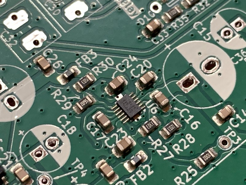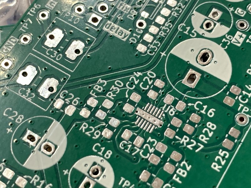 いい感じ。このIC、足は外に出ていないので本来はハンダはほとんど外には出ない。しかし、手ハンダもできるように、ランドを拡張してかなり外に引っ張り出した。これも問題なく実装できている。