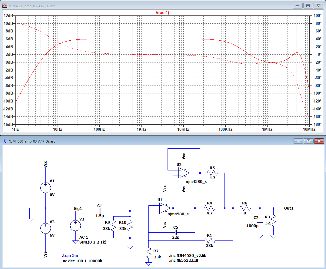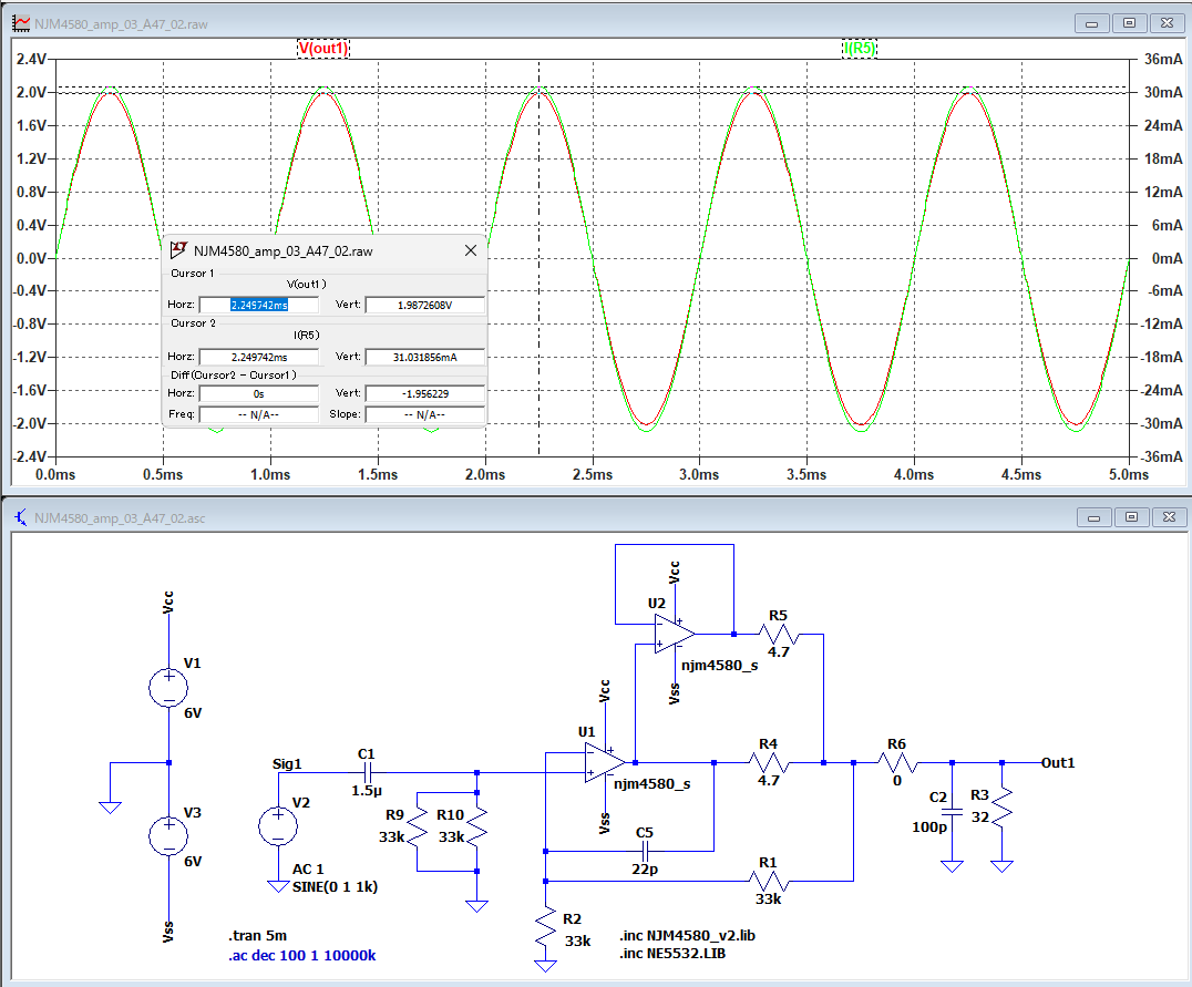 ここで懸念されるのが、合成抵抗を下げたことによるオペアンプ間の「無効電流(横流し電流)」の発生ですが、オフセット電圧が十分に小さいオペアンプであれば、その影響は極めて限定的です。2つのオペアンプ出力はそれぞれ 4.7Ω の抵抗を通って結合されているため、オペアンプ間には合計 9.4Ω の抵抗が入ることになります。