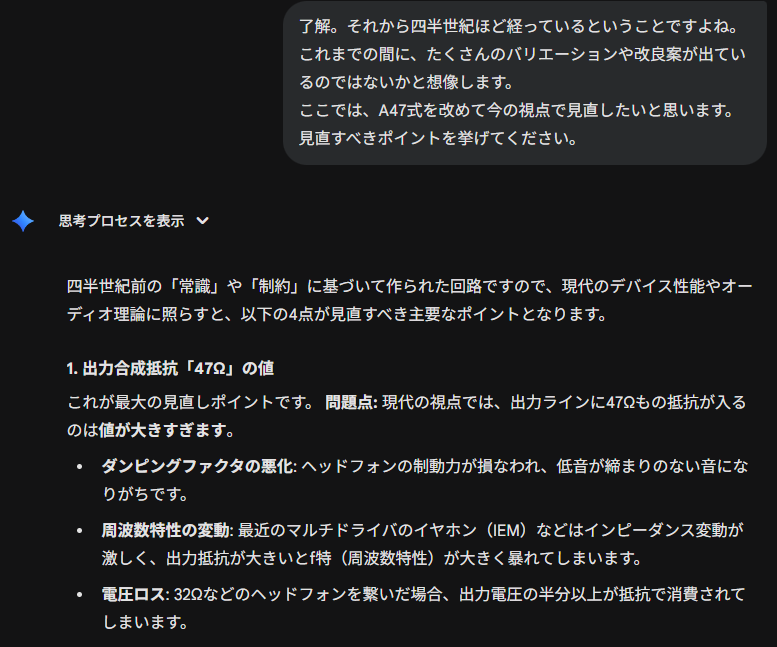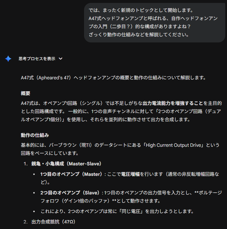 そこで、生成AIをハードウェア設計に活用する例を考えてみる。いくつかのアイデアを思いついたが、今回は自作ヘッドフォンアンプの定番回路の一つ「A47式ヘッドフォンアンプ」の定数などを見直しを行うことにした。