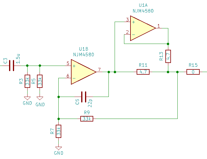 入力カップリングコンデンサには、入手性を考慮して 1.5μF のフィルムコンデンサを採用しました。入力抵抗 16.5kΩ(33kΩ の2パラ)との組み合わせによる低域カットオフ周波数は約 6.4Hz となり、可聴域(20Hz 〜)に対し十分な特性を確保しています。