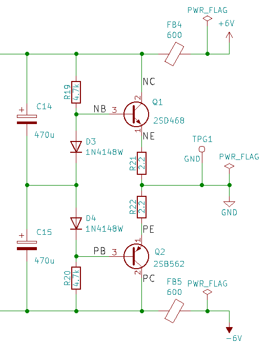 この仮想GND生成にはディスクリート・レールスプリッタ(Sijosae式)を採用しましたが、アンプ部の大電流駆動に対応させるため定数を見直しました。通常 10Ω が使われるエミッタ抵抗を 2.2Ω へと変更し、仮想GNDの内部抵抗を低減しています。これにより、基準電位が揺らがない強固な電源を実現しています。