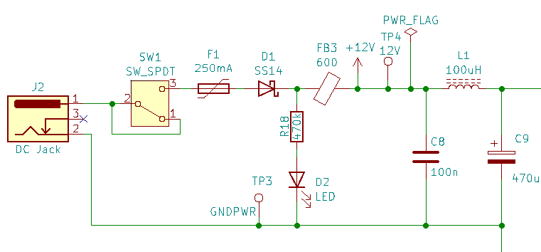 50mAのリセッタブルフューズ(ポリスイッチ)とダイオードを配置しました。不測のショートや電源の逆接続から回路を保護し、安全性を確保しています。 - 電源ノイズフィルタ: