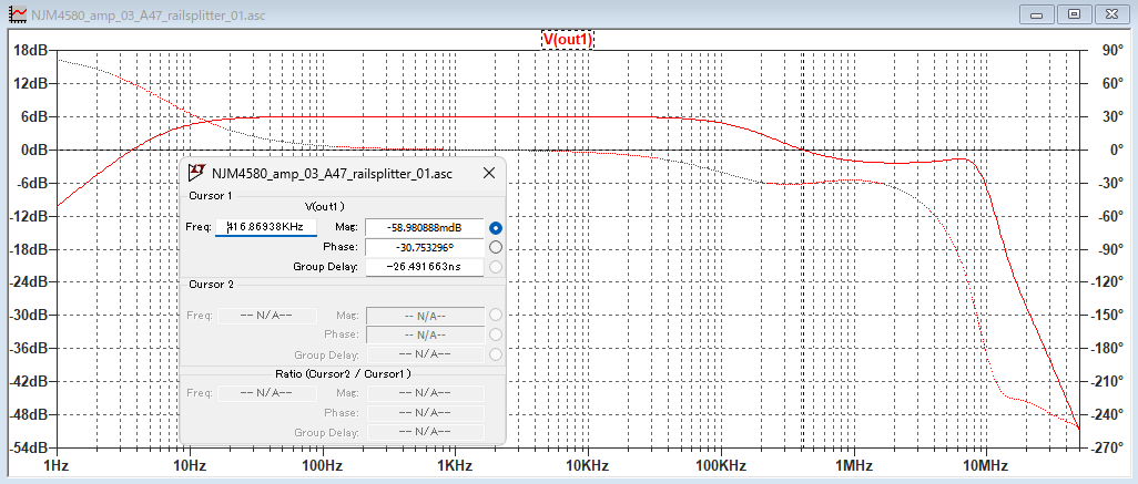 • 4.7Ω設定時: 0dB 地点(約 7.76 MHz)における位相は -139.97 °