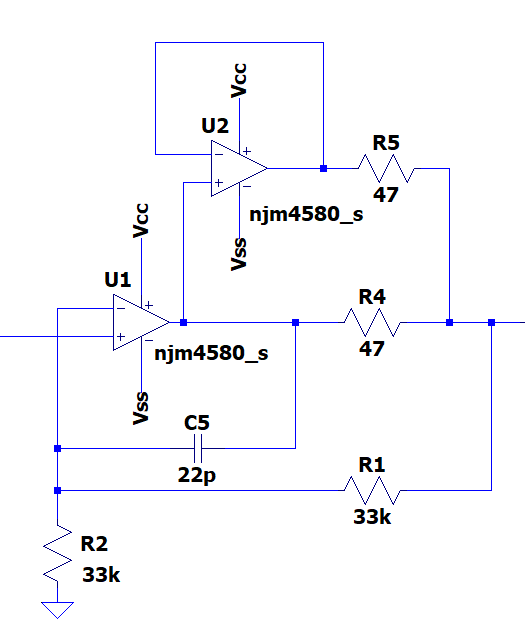 回路はそのままで、出力合成の抵抗を47Ωに変更する。負荷が64Ω+1nFでの周波数特性。オペアンプはNJM4580。