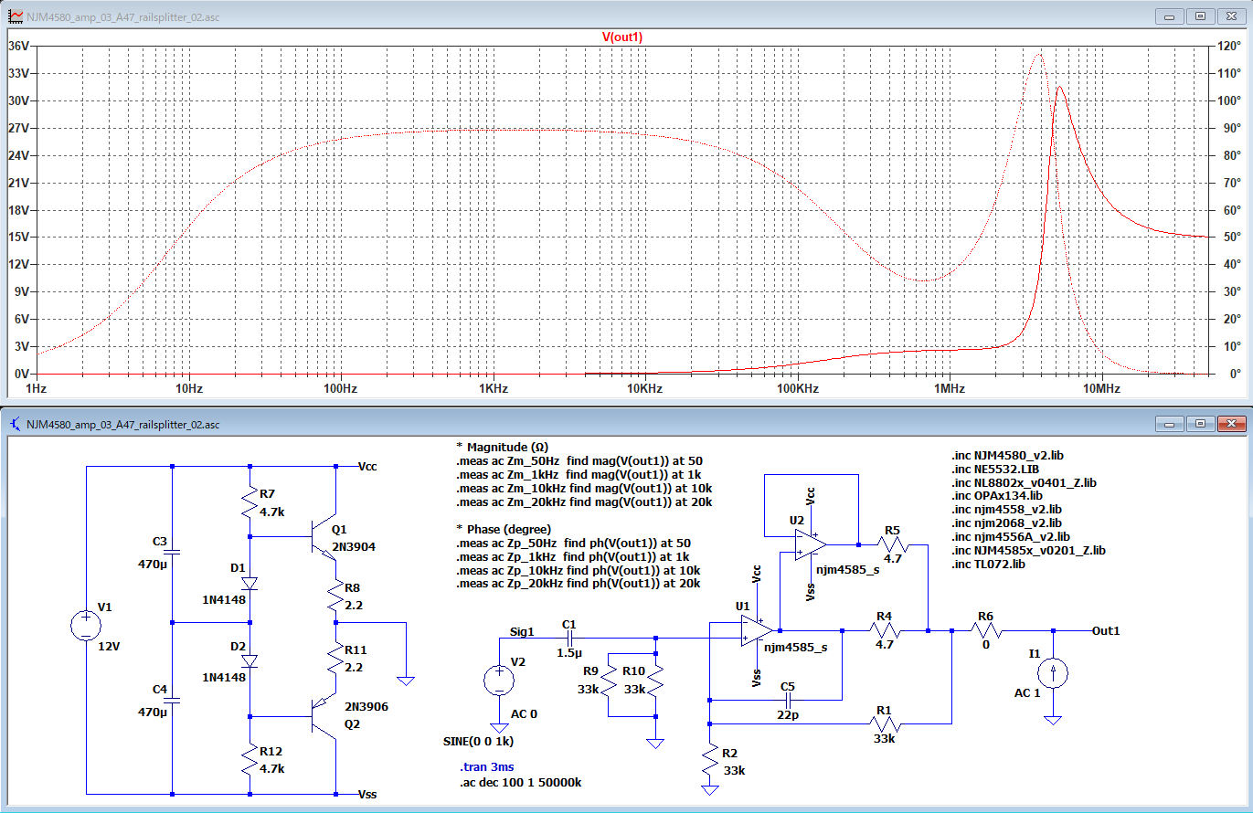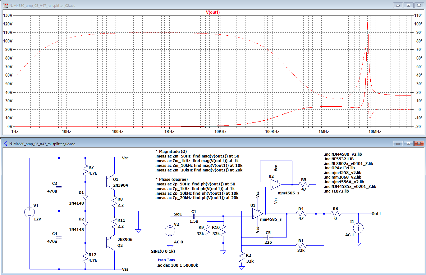 A47式ヘッドフォンアンプを生成AIを使って再考する話の続き。今さらながらではあるが、今回のものが本来のA47とどう違うのか気になってきた。これもシミュレーションで確認してみる。