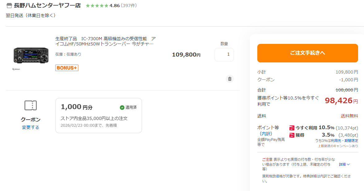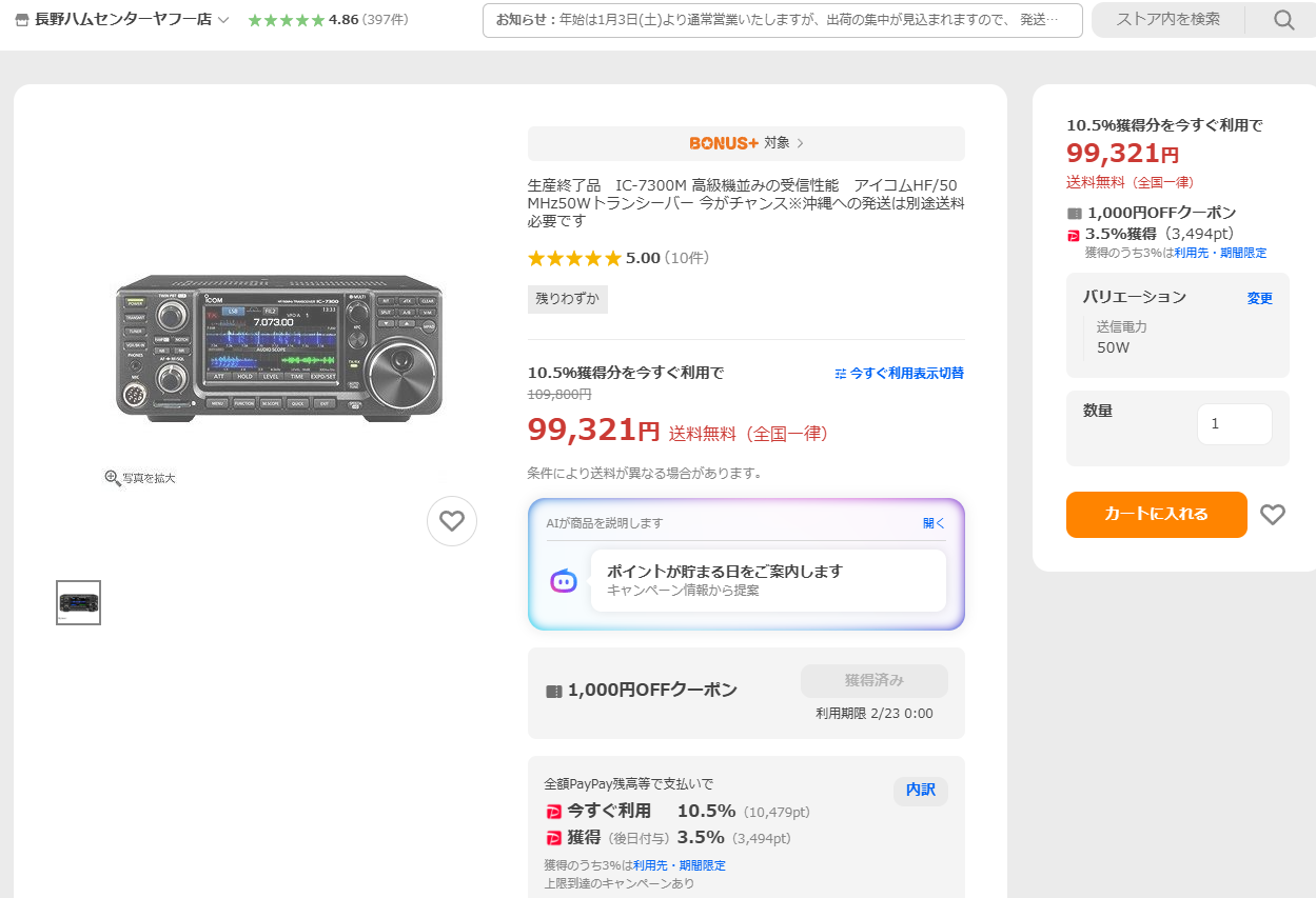 「長野ハムセンターヤフー店」のIC-7300Mの販売ページのリンクはこちら。