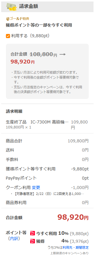 支払額が98,920円で、獲得ポイントが3,976。差し引きの実質額は、94,944円。前回は95,954円だったので、1,010円の値下がり。前回は払額が97,920円で1,000円少なかったのだけど、今回は獲得ポイントが大きく増えたので、実質価格は安いということになった。