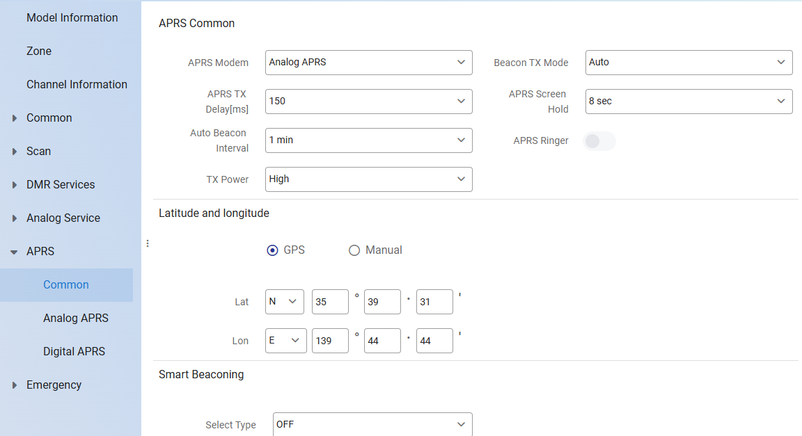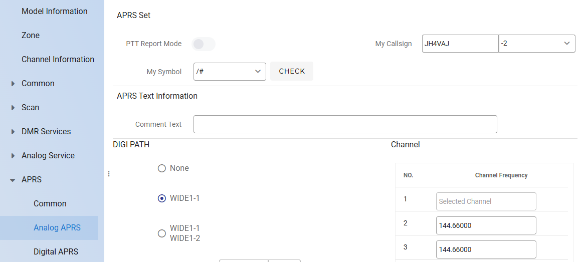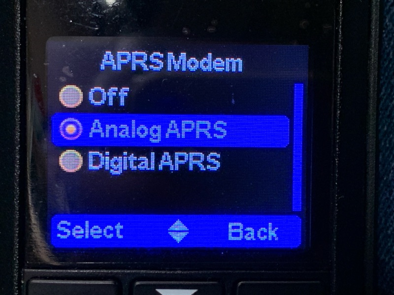 APRS Modemは「Analog APRS」を選択。Digitalもあるけれど、少なくとも日本ではほとど使われていないみたい。APRSを使わない場合は、ここをOFFにする。