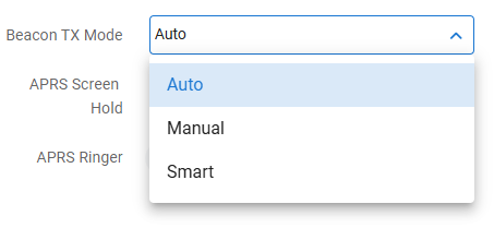 「Auto」を設定すると、Auto Beacon Intervalで設定した時間間隔で送信する。「Smart」は移動速度に応じて動的に送信間隔を調整する(はず)。「Manual」だとPTTスイッチを離したタイミングでビーコンを送信する。PTTを離してからどれだけの時間を置いてビーコンを送信するかがAPRS TX Delay。