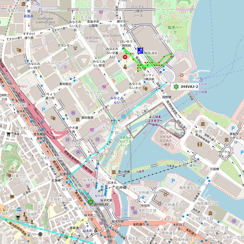 パシフィコ横浜を出て、桜木町まで徒歩。テスト目的ということもあり、Autoで1分間隔で送信した。パシフィコ横浜からはしばらく建物の中だったのでしばらくデータが飛んでいる。途中で外に出たので、そこからは道に沿ってちゃんとトレースできている。面白い。