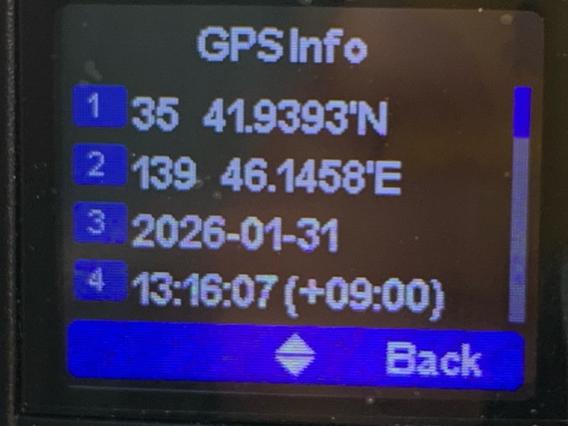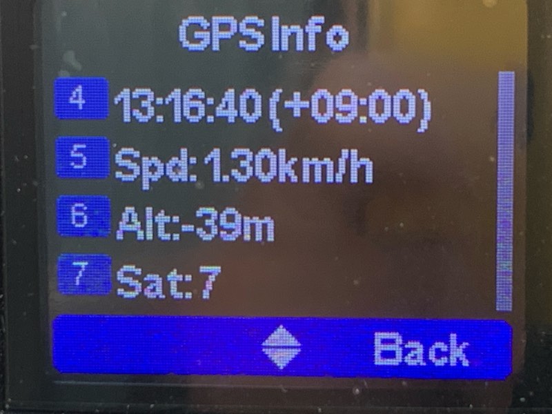 GPSのメニューに入ってGPS Infoを開くと、諸々の情報が見られる。