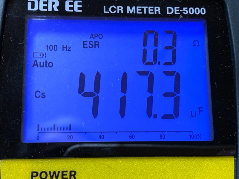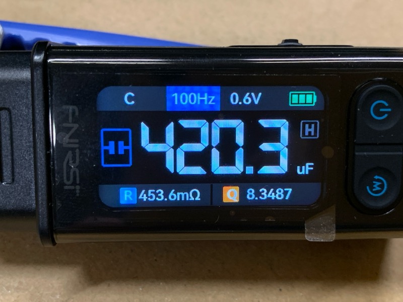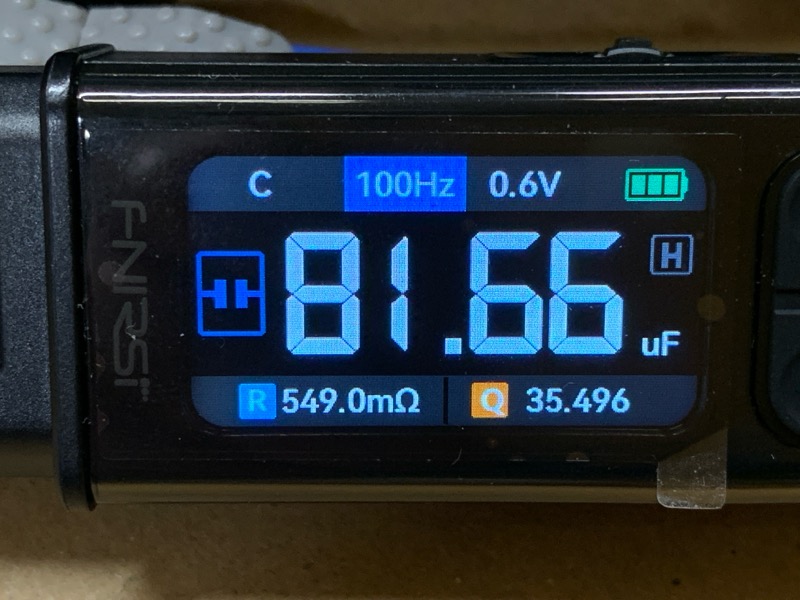 下の写真は電解コンデンサを測定したもの。82μFのOS-CONと、470μFの一般アルミ電解コンデンサ。静電容量は概ね一致しているが、ESRはだいぶ大きい値になっている。なお、測定周波数はいずれも100Hz。